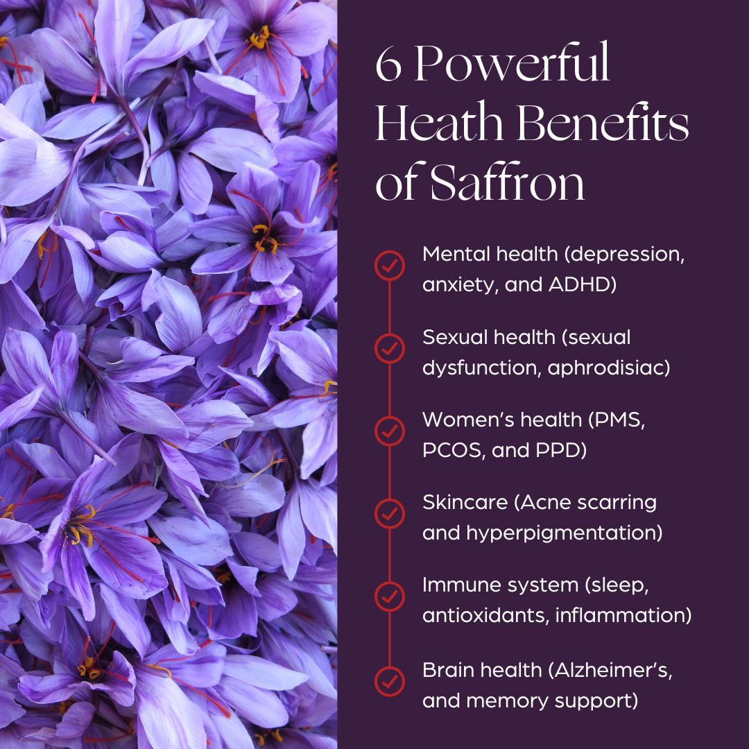 Saffron has been used since ancient times for sexual health, depression/anxiety, insomnia, acne, and much more.