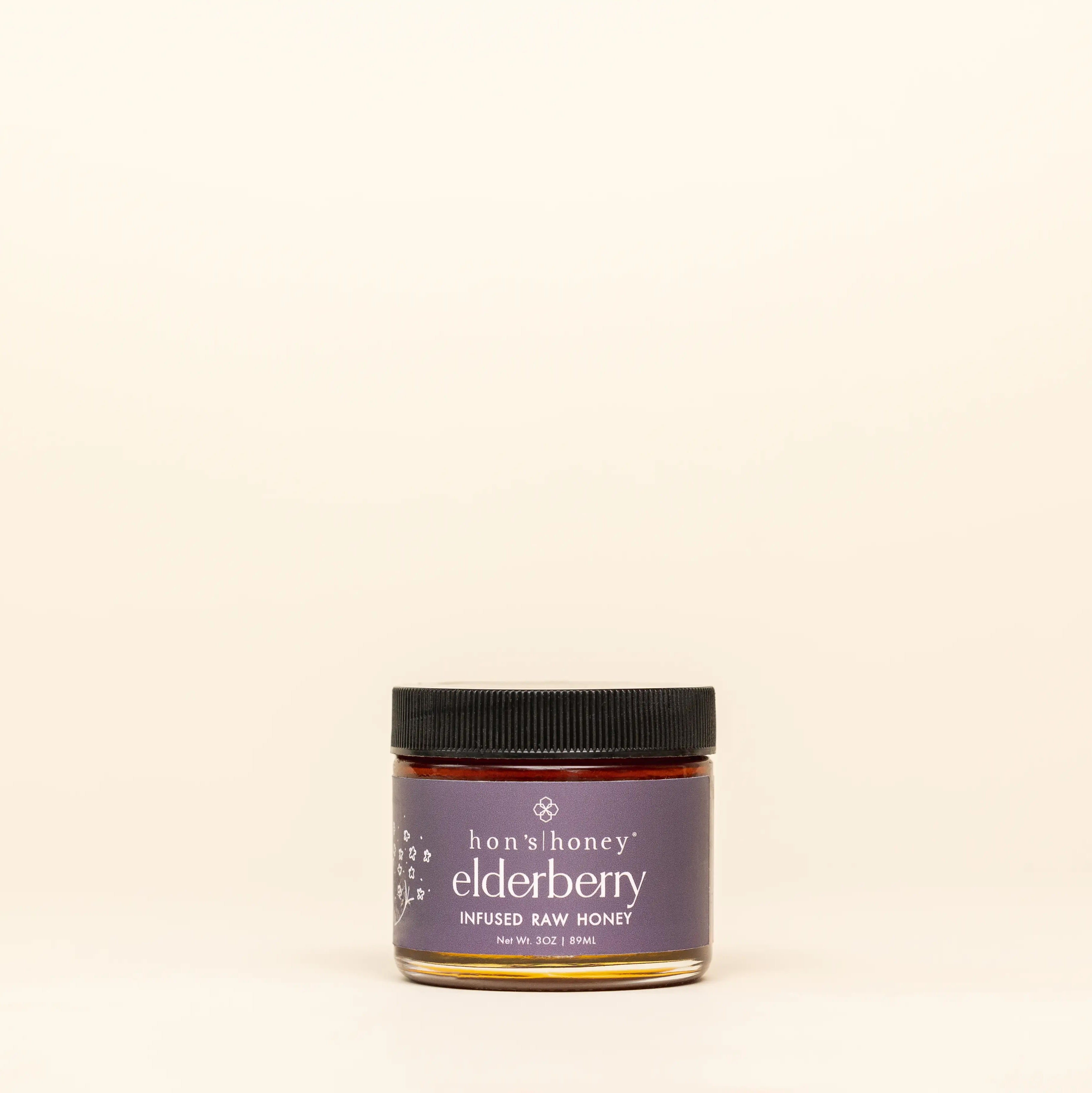 -Hon's Honey Elderberry Honey Sampler: Raw honey infused with elderberry and lemon peel to nourish your body.